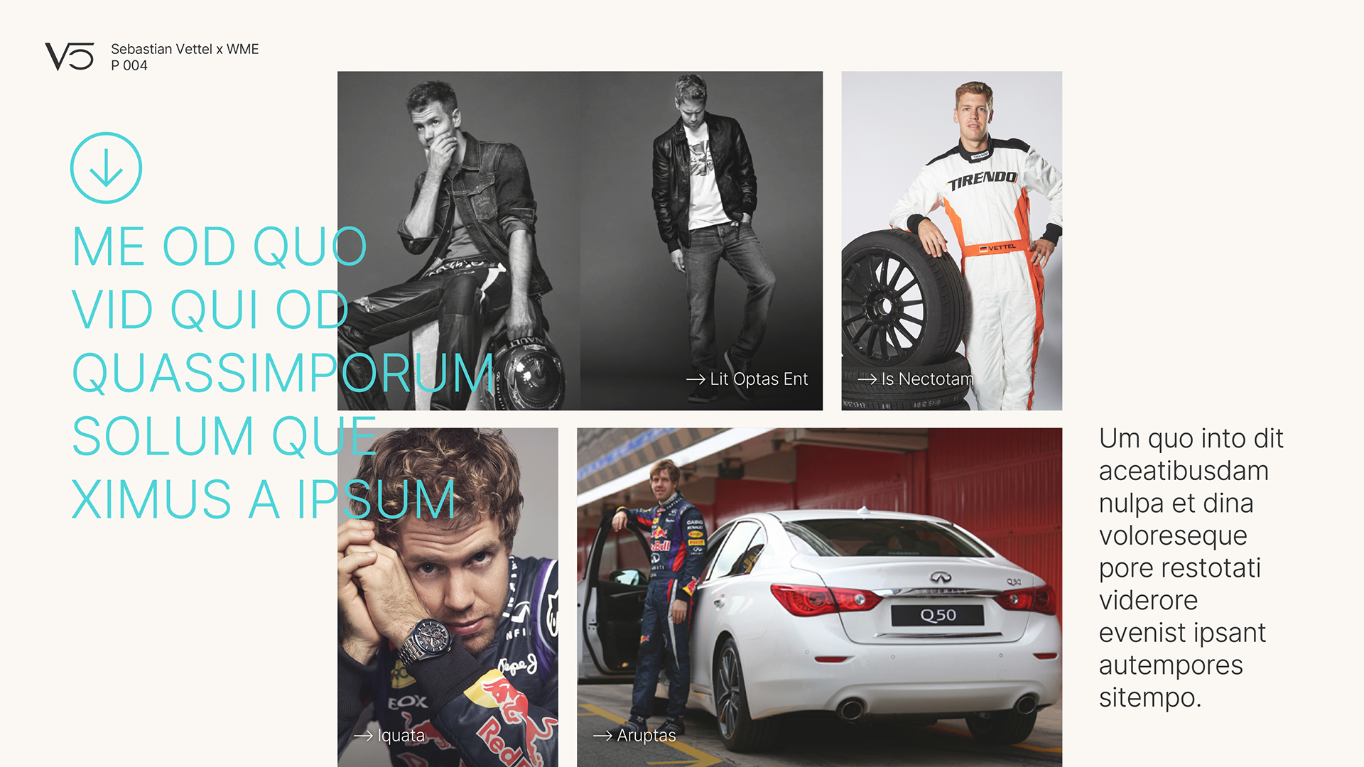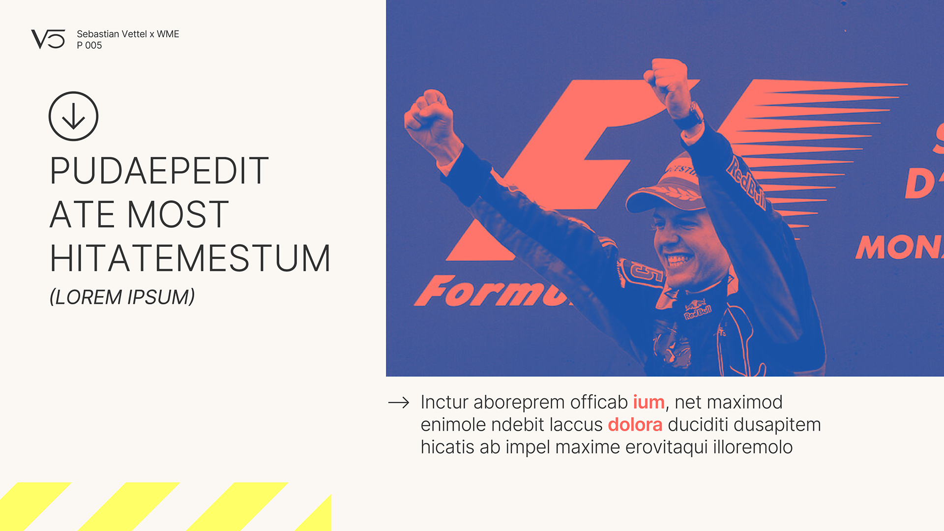 Using the provided copy, I led the creative direction for this project, crafting a tailored presentation for Sebastian Vettel's agent that showcased his previous brand collaborations, audience reach, social impact initiatives, and racing achievements. Given the length and the high confidentiality of the project, I have included only my six favorite pages of the deck and replaced all details with placeholder text.